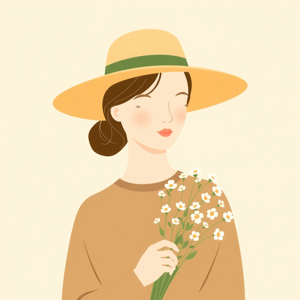 A simple and warm flat illustration of a young woman in a wide-brimmed hat, clutching a bouquet of delicate flowers, showcasing minimalist and utilitarian principles. The composition employs clean geometric shapes and a soft color palette inspired by Danish design aesthetics, with gentle lines to convey a sense of warmth and simplicity.