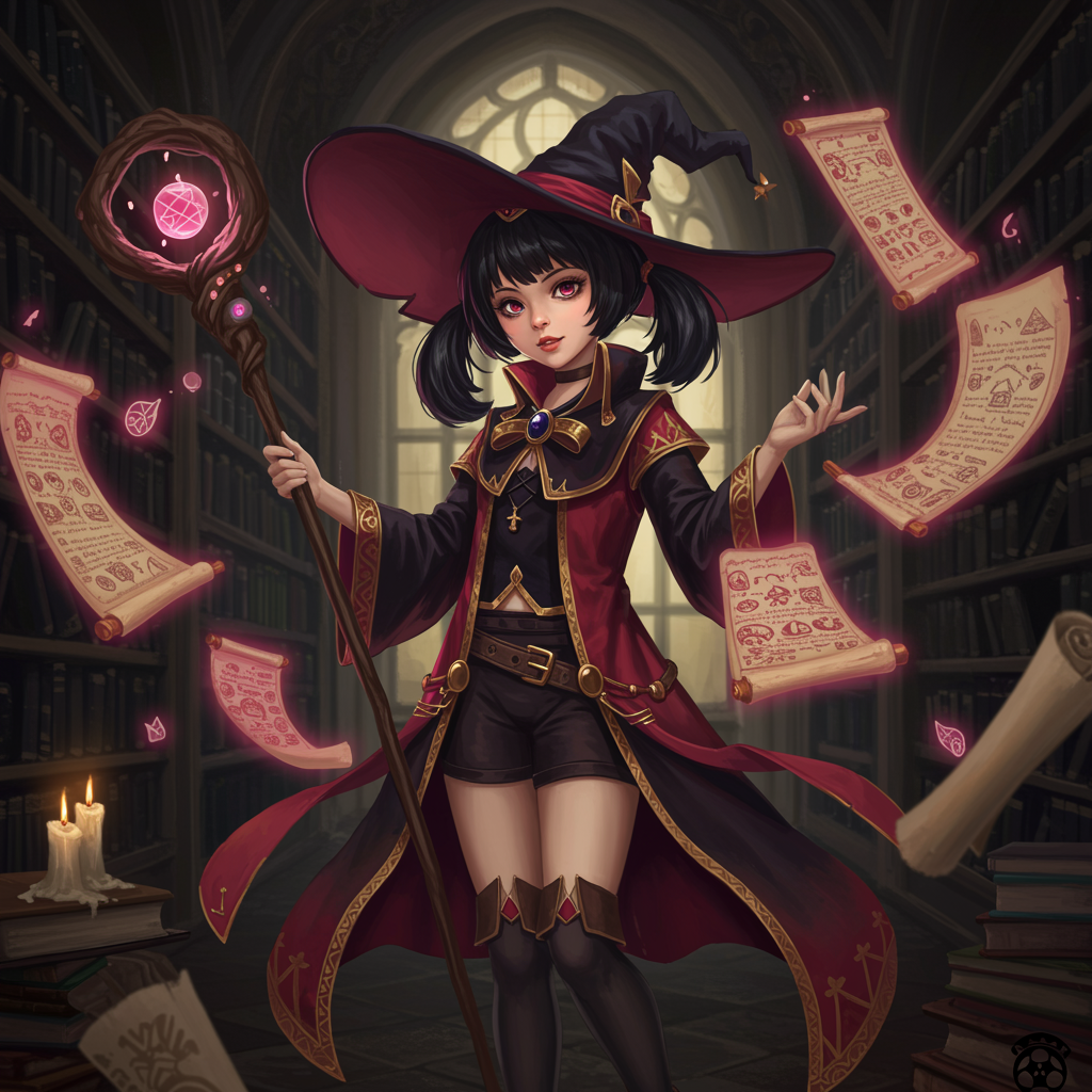 A single fantasy girl with distinct short black twintails stands in a magical library, adorned in a striking red and black Arabic-influenced robe. She holds a mystical staff and has a witch hat perched on her head. Intricate magic scrolls hover around her, casting an enchanting glow. The dim candlelight enhances the mystical ambiance, highlighting the high-definition details of her surroundings. Her expression is focused and slightly cross-eyed, capturing the viewer's attention with a uniquely charming demeanor. The library setting exudes an aura of ancient wisdom and arcane knowledge, creating an immersive fantasy scene. Minor creative adjustments accentuate her magical persona, avoiding any low-quality visual distractions or imperfections.