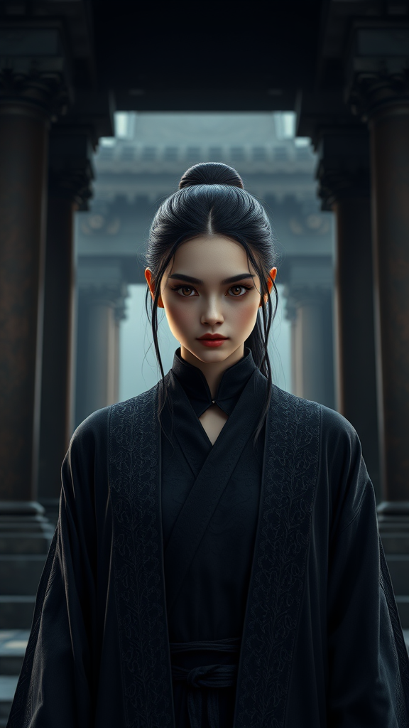 A single female figure stands in focus, clad in dark, intricately detailed robes. She is situated against the backdrop of an ancient temple, framed by symmetrical, striking eyes that lend her an air of mystery. The scene is brought to life with dramatic, realistic lighting that enhances every detail in sharp focus, resulting in an ultra-realistic and highly complex photography. Utilizing hyperrealistic techniques like raytracing and physics-based rendering, the image exudes depth and clarity, similar to a high detail RAW color photograph. Set in ultra-high resolution, this digital masterpiece serves as a unified 8K wallpaper, showcasing stunning CGI elements. Despite its cartoon and anime roots, the digital illustration maintains a precision reminiscent of realistic photography, devoid of any imperfections that would detract from its overall appeal.
