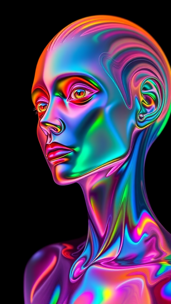 A single figure, a mesmerizing psychedelic bioluminescent being with a vibrant color palette dominated by shades of orange, pink, green, and blue. A multicolored rainbow portrait inspired by the visionary styles of Moebius and Beksinski, featuring iridescent, shimmering skin with an oil-on-water effect. The figure resembles a rainbow-colored liquid form, like a molten silver surfer, showcasing detailed sculpture and precise anatomy. The composition exudes symmetry and surrealism, echoing the haunting atmosphere reminiscent of Beksinski. The intricate brushwork pays homage to Caravaggio, rendered in oil on canvas. An award-winning, dramatic masterpiece, capturing attention with its fantastic view, trending on ArtStation. Displayed in 8k UHD HDR against a stark black background.