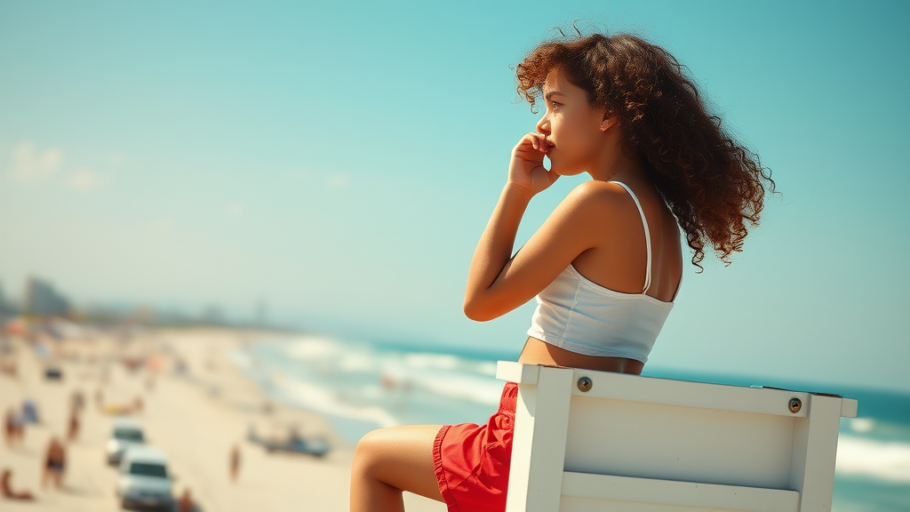 A single girl lifeguard perched on a sunlit white tower, wearing a simple white top paired with bright red shorts. Her curly brown hair catches the light as she blows a whistle, scanning the bustling beach with watchful eyes of natural hue. The scene is captured in stunning 8k resolution, with precise color grading and depth of field, enhancing the vivid, sun-drenched atmosphere.