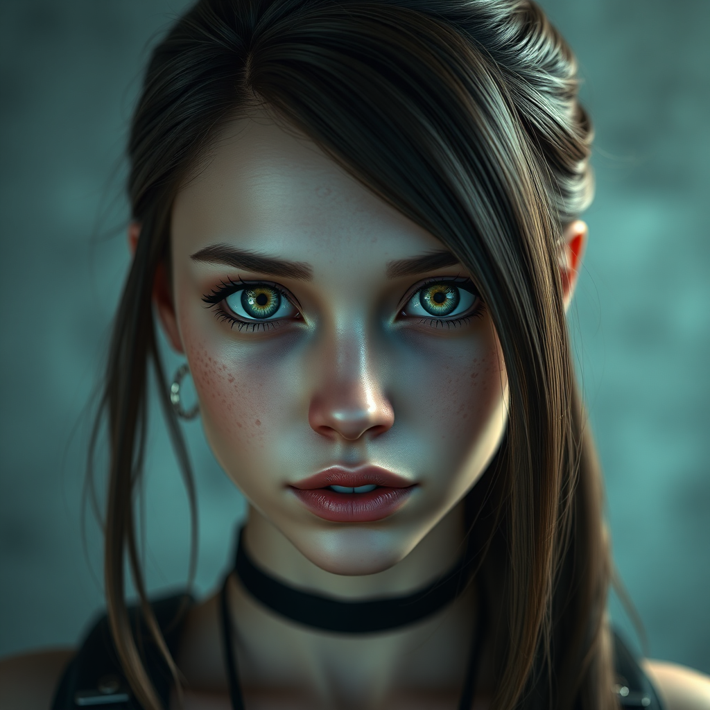 A single girl resembling Jill Valentine from Resident Evil 3 Remake, depicted in a Redshift style with a flawless face, intricate and elegant features, highly detailed, and trending on ArtStation, inspired by the artistry of Tom Bagshaw and Seb McKinnon. Captured in a 150mm portrait with a cinematic photography approach using Octane Render. Photographed with a Hasselblad H3DII, the image showcases an extremely detailed face with unique imperfections, including a distinct eye and stylized, slightly deformed features in a CGI and cartoon-like manner, adding a creative twist while maintaining the essence of the character.