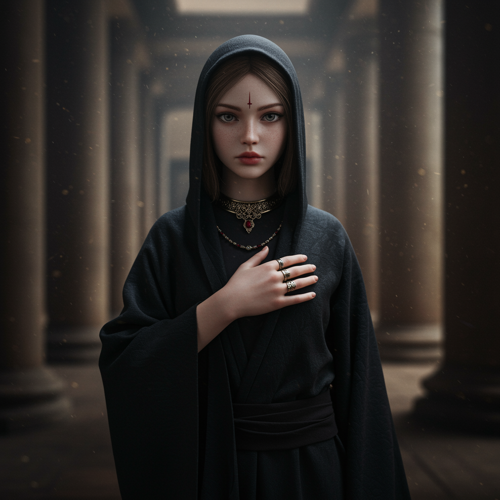 A single girl stands in a temple setting, draped in dark, elegant robes. Her symmetrical eyes gaze intensely amid dramatic lighting, creating a strikingly realistic and sharply focused scene. The photograph is high-definition, showcasing intricate details with hyperrealistic quality through physics-based rendering and ray tracing technology. Captured as an ultra high-resolution, highly detailed CG image suitable for 8K wallpapers, the scene is enhanced with finely crafted jewelry that complements her attire. The composition avoids any imperfections such as distortion or poor anatomy, ensuring a flawless portrayal with balanced proportions and well-defined features. The essence of digital art and painting shines through the realism, offering a visually captivating experience that merges artistic creativity with technological excellence.