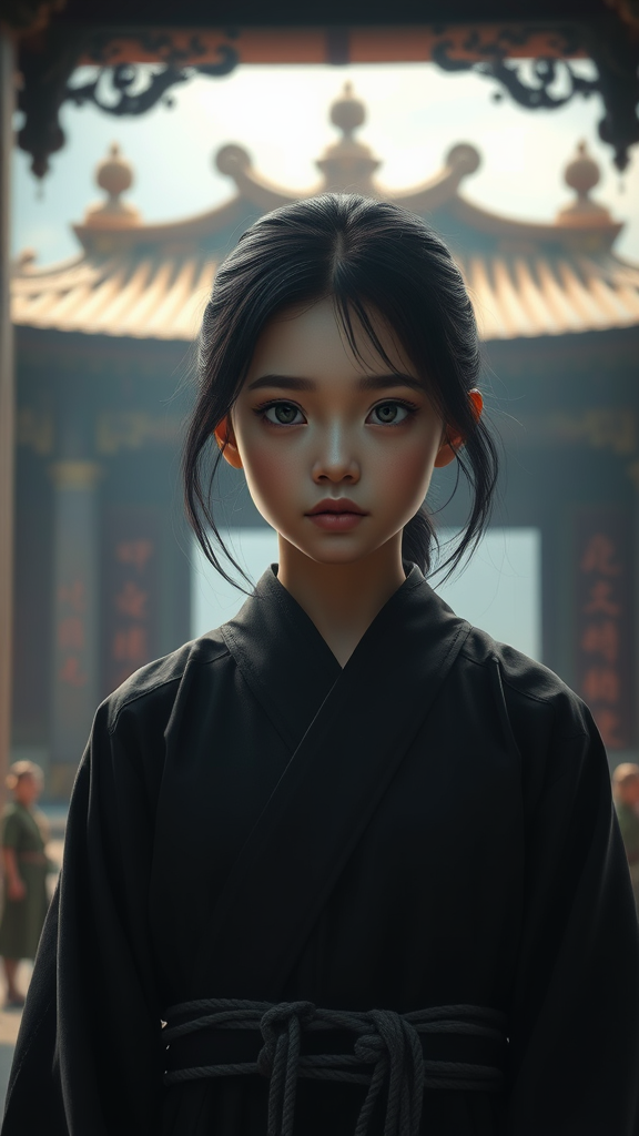 A single girl wearing dark robes in a temple background with symmetrical eyes and dramatic lighting. The scene is realistic with a sharp focus in HD, featuring complex and intricate details akin to high-detail RAW color photography. The setting is hyperrealistic with elements of raytracing and physics-based rendering, presented in ultra-high resolution with highly detailed CG. The image is suitable for unified 8K wallpapers. Avoid low quality elements, such as text errors, poor proportions, or disfigurement, ensuring anatomical accuracy in a seamless, captivating digital art piece.