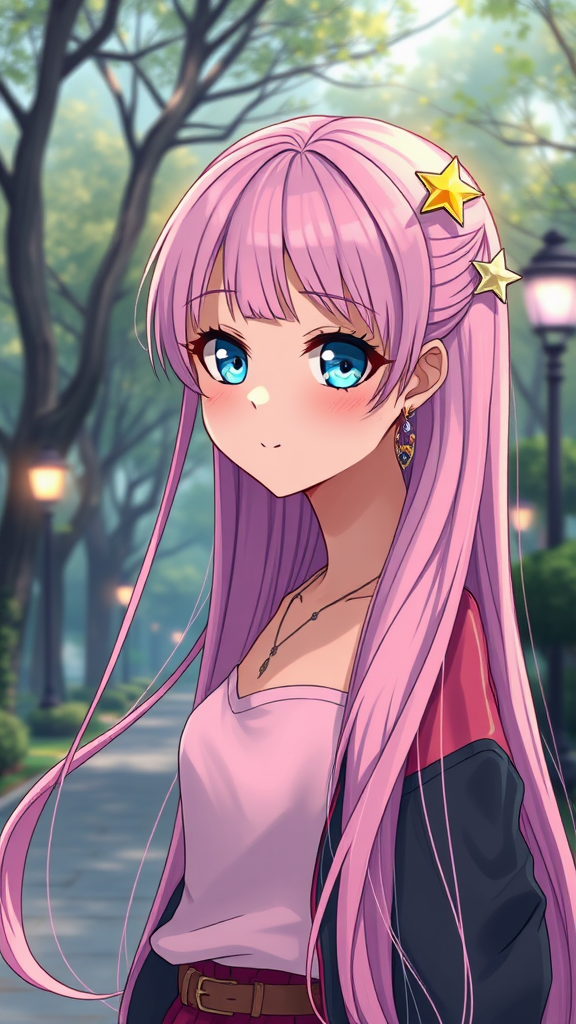 A single girl with intricate blue eyes and very long pink hair stands in a detailed park background. She wears stylish earrings and other delicate jewelry, paired with a skirt and a trendy jacket. Her expressive eyes and warm smile are captivating, as star hair ornaments glisten in her flowing hair. The scene is vibrant with vivid colors and rendered in an anime and manga-inspired style, utilizing digital art techniques like glow effects and sharp focus. The artwork is hyperrealistic and masterfully crafted, reminiscent of professional oil paintings. The setting is atmospheric and dramatic, with a profound depth of field akin to cinematic photography. This captivating image is influenced by the artistic styles of Studio Ghibli, Jeremy Mann, and Greg Manchess, making it a trending piece on platforms like ArtStation and CGSociety.
