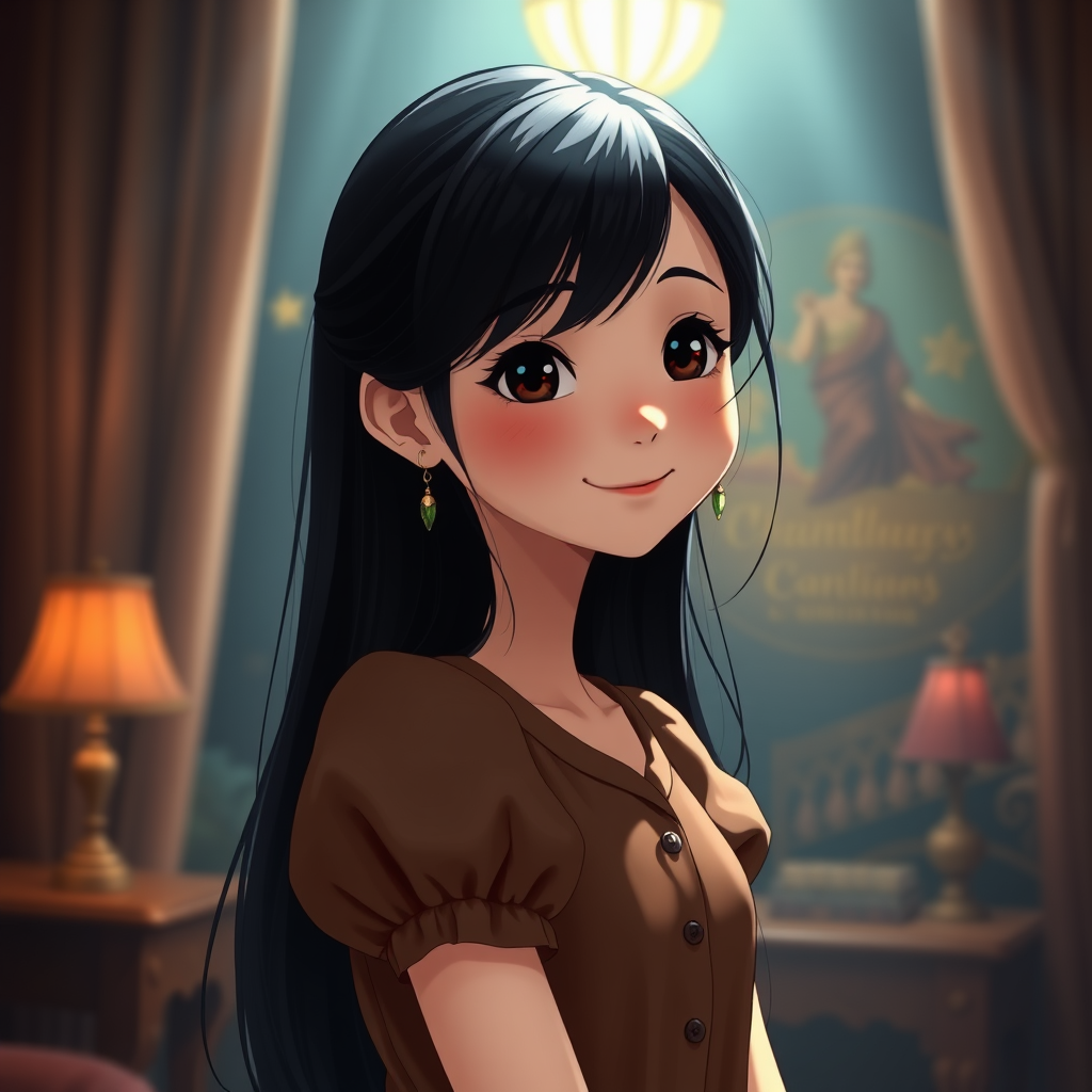 A single girl with long black hair and deep black eyes smiles warmly at the viewer. She wears a pair of delicate earrings and a brown dress featuring puffy short sleeves, and adorns her wrists with elegant jewelry. Her elegant pajamas in a charming 1950s style accompany the puffy dress. The background is rich and dark, reminiscent of a classic film noir scene, and is intricately detailed with atmospheric depth, creating a sense of nostalgia. Her cheeks are slightly blushed, and her lips are subtly highlighted, capturing a harmonious blend of Disney and Pixar influences. The setting is vividly rendered in 8K UHD, with a glow effect that enhances the image's enchanting allure. The artwork is an anime-inspired, manga-style digital composition, featuring hand-drawn elements and cinematic lighting akin to a masterpiece by renowned artists. This photorealistic, high-detail painting incorporates vivid colors and sharp focus, bringing together the styles of Studio Ghibli, Jeremy Mann, and Greg Manchess. This creation, trending on ArtStation and CGSociety, boasts a polished, hyperrealistic finish without imperfections or distractions, embodying a concept art piece of remarkable beauty and craftsmanship.