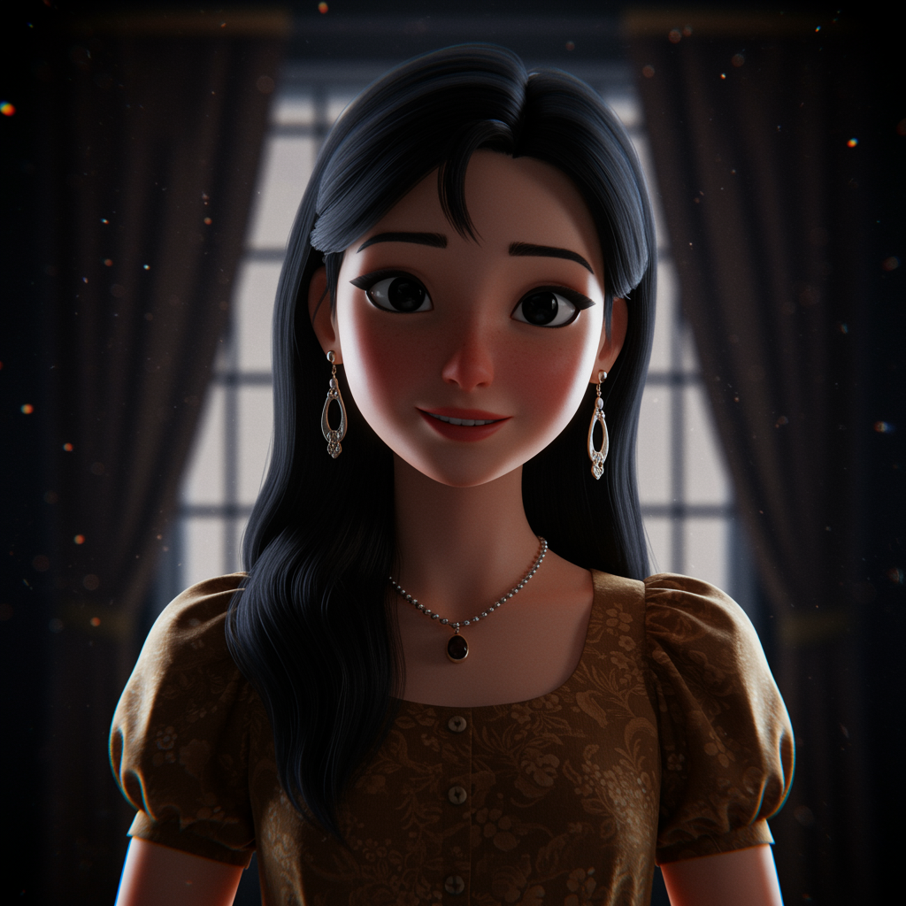 A single girl with long black hair and deep black eyes. She is smiling, wearing elegant earrings and a stylish brown dress with short, puffy sleeves, adorned with jewelry. Her pajamas are depicted in a 1950s-inspired dark, highly detailed background. The scene captures a sense of warmth with a hint of blush on her cheeks and lips, resembling the charm of Disney and Pixar animations in an anime style. The image is a blend of hand-drawn and digital art techniques, incorporating glow effects and rendered in tools like Octane Render, Cinema 4D, and Blender. It's crafted in an 8K UHD HDR format, featuring a dark, atmospheric setting with vivid colors, sharp focus, and big depth of field, reminiscent of a cinematic masterpiece. The colors are rich and vibrant, evoking the style of a professional majestic oil painting by renowned artists such as Ed Blinkey, Atey Ghailan, Studio Ghibli, Jeremy Mann, Greg Manchess, and Antonio Moro. The piece is intricate and high in detail, trending on platforms like ArtStation and CGSociety, showcasing hyperrealistic textures and a photorealistic finish without imperfections such as mutations or disfigurements, creating a polished and beautifully executed artwork.