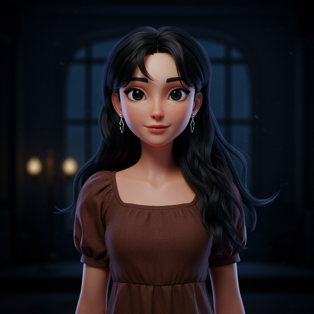 A single girl with long, flowing black hair and captivating black eyes stands confidently, her warm smile adorned with delicate jewelry. She sports earrings and a stylish brown dress with puffy short sleeves, paired with comfortable pajamas. The setting exudes a 1950s dark, atmospheric charm with a richly detailed background that feels almost cinematic. Her upper body is highlighted in an anime-style, blending the magic of Disney and Pixar with a 3D, hyperrealistic touch. The glow effects and vivid colors bring the scene to life, with a blend of hand-drawn artistry and digital precision from tools like Octane Render and Cinema 4D. Masterpiece-level detailing and bold hues create a sharp, immersive visual. This evocative scene is reminiscent of the works by Studio Ghibli, Jeremy Mann, and Antonio Moro, capturing a dramatic yet elegant essence trending on platforms like ArtStation and CGSociety, while maintaining a whimsical anime and manga style influenced by the art of Greg Rutkowski and Atey Ghailan.