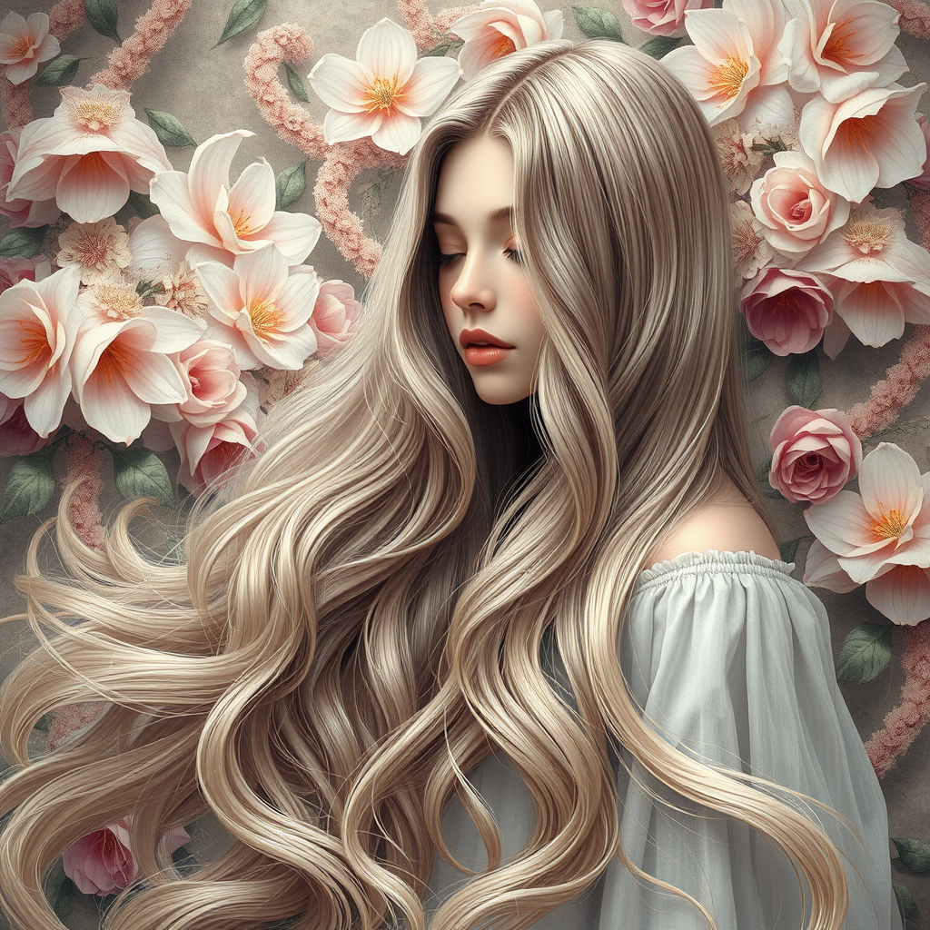 A single girl with long, lustrous, wavy hair cascading like a river of silk, rendered with extraordinary attention to detail. The scene interweaves ultra-detailed floral elements and intricate vector illustrations, creating a seamless blend of hyper-realism and fantasy allure. Subdued pastel hues infuse the composition, with an intricately detailed floral backdrop enhancing the ethereal feel. The image exudes an overwhelming sense of realism, presenting a complex, magical atmosphere reminiscent of dreams. Capturing the scene in spectacular high-definition 16k with HDR, it transcends ordinary visuals, immersing viewers in an enchanting, surreal experience that borders on the fantastical, steering clear of unrealistic or nightmarish elements.