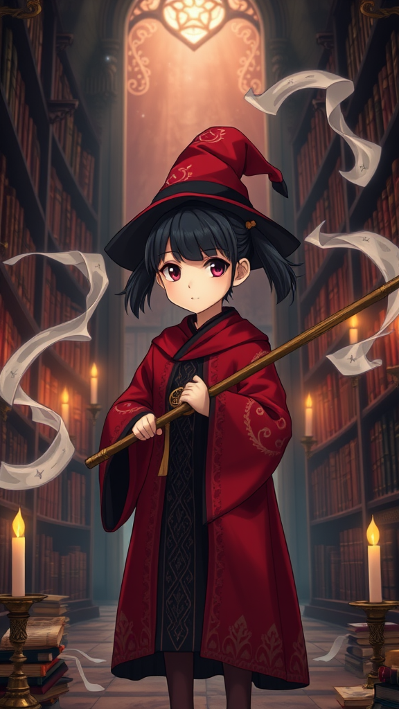 A single girl with very short black hair styled in twintails stands in a library setting. She is dressed in a red and black robe with an Arabic-inspired design and wields a magical staff. She is surrounded by swirling magic scrolls and wears a traditional witch hat. The warm glow of candles adds to the mystical atmosphere. The scene is depicted in 8k with UHD and HDR detail. The background features towering bookshelves filled with ancient tomes. The girl's expression is focused, with her eyes gazing intently at the viewer. The magic in her surroundings is vibrant and dynamic, enhancing the fantastical theme. The composition is clean, with crisp detail and no visual distractions, maintaining an immersive and enchanting mood.