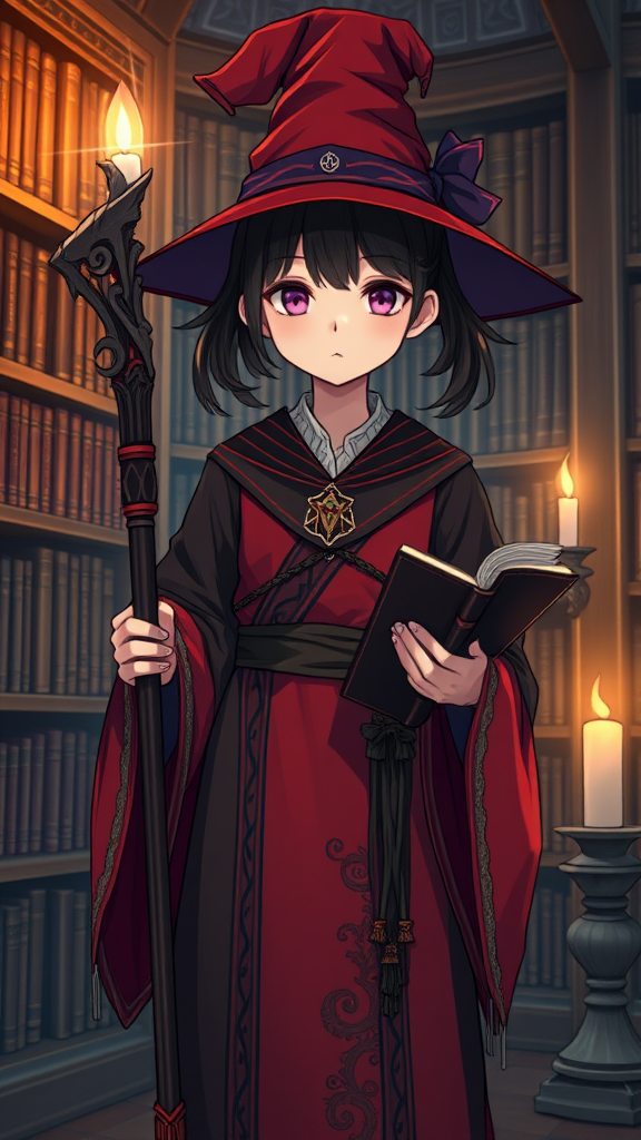 A single girl with very short black twintails stands in a library, wearing a red and black robe influenced by Arabic design. She holds a magic staff and possesses magic scrolls. On her head rests a witch hat, and a candle glows nearby. The scene is captured in 8k UHD with HDR, showcasing vibrant fantasy elements. Her expression is focused, adding to the mystical atmosphere. Watch for duplicated features or unnecessary mutations and avoid any low-resolution or blurred effects. Ensure the composition is clear without artifacts, logos, text, or disruptions.