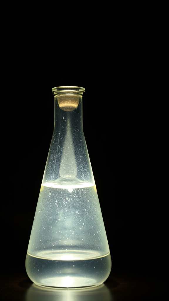 A single glowing essence contained within a crystal-clear flask, set against a deep ebony backdrop, capturing the contrast vividly. The scene emphasizes the purity and intensity of the light source inside the bottle, enhancing its mystical allure. The dimensions are tall and slender, drawing the eye upwards in a seamless vertical journey. The overall style is unrefined and organic, celebrating natural imperfections and raw beauty.