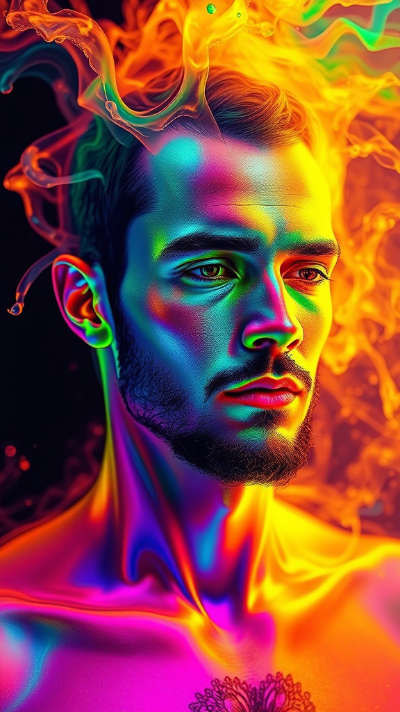 A single man surrounded by a psychedelic bioluminescent aura, enveloped in a vibrant color palette dominated by rich hues of orange, pink, green, and blue, creating a multicolored rainbow portrait. The artwork is inspired by the styles of Moebius and Beksinski, featuring iridescent skin with an oil on water effect. The figure embodies a rainbow-colored liquid essence, melting like a surreal version of the Silver Surfer. One can notice the intricate detailing akin to a sculptor’s touch, showcasing accurate anatomy and symmetry. This surreal masterpiece is reminiscent of a combination of Caravaggio's dramatic oil paintings and Carl Spitzweg’s imaginative storytelling, all rendered on canvas. The award-winning composition is trending on ArtStation, presented in 8k UHD with HDR, capturing the fantastic view of a vibrant spectrum against a deep black background.