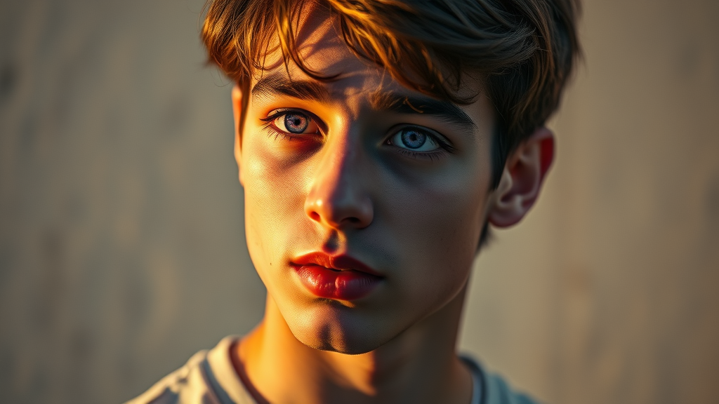 A single man with striking purple eyes, captured in a finely detailed and breathtaking style with cinematic lighting during the day. The dynamic lighting highlights his features against a simple background with a depth of field effect, giving a CG-like appearance. He is wearing casual clothes, exuding a relaxed and approachable vibe. Despite being in a side view, the image maintains clarity with minimal artifacts, presenting a normal quality finish. The setting is balanced, neither too revealing nor overly complex, striking a youthful yet mature tone with a clean and polished presentation.