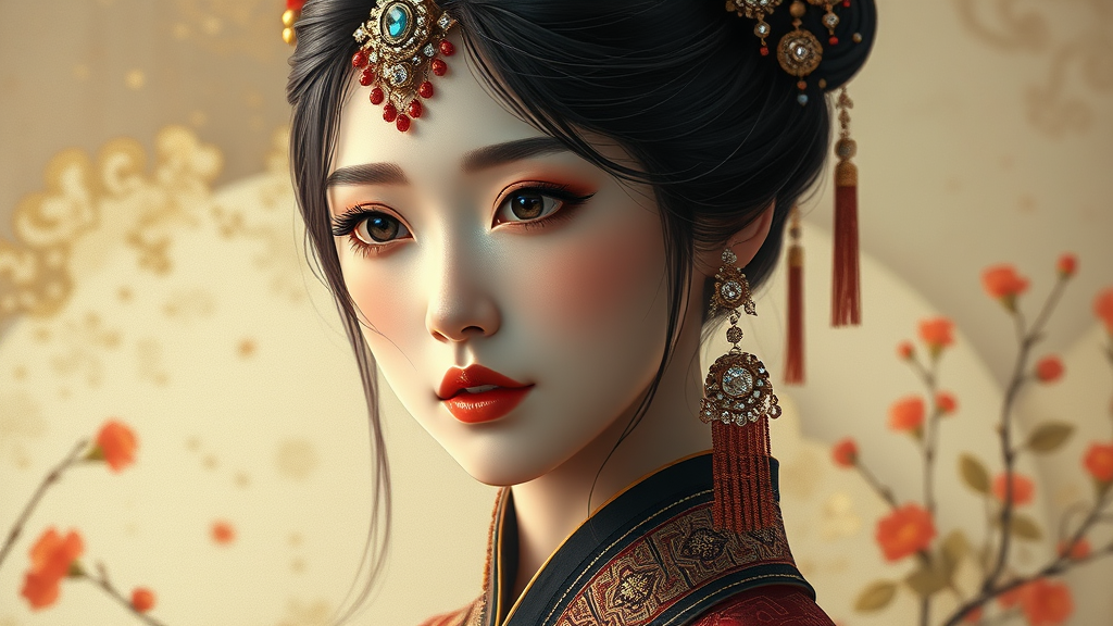 A single, stunning Korean girl, depicted in an extremely detailed CG illustration featuring intricate and ultra-detailed elements. The scene embraces Korean tradition, rendered artistically with fantastic and cinematic lighting. The focus is on one beautiful girl, presenting a solo composition with a beautifully detailed face adorned in glittering accessories. The image is enhanced with elegant lineart against an abstract background inspired by art nouveau, creating a dynamic composition. The resolution is 8k, UHD, HDR, emphasizing clarity and vividness. Avoid elements like duplication, mutation, mutated features, low resolution, out of frame details, blurriness, jpeg artifacts, watermarks, logos, text, or any split images.