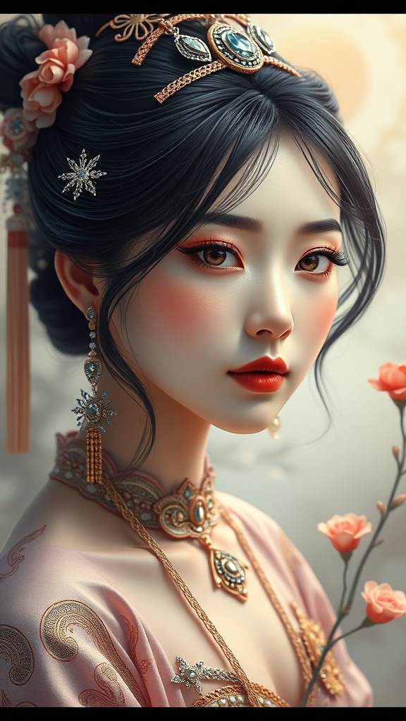 A single, stunning Korean girl, portrayed in an ultra-detailed CG illustration with intricate artistry and cinematic lighting. Her beautiful, detailed face is complemented by sparkling accessories. The composition is dynamic, blending Korean tradition with art nouveau elements, set against an abstract background. The image is in 8k, UHD, HDR quality, showcasing her elegance and charm. The overall design emphasizes clarity, avoiding any distortions or low-resolution artifacts, focusing solely on delivering a captivating and coherent visual masterpiece without any distractions or imperfections.