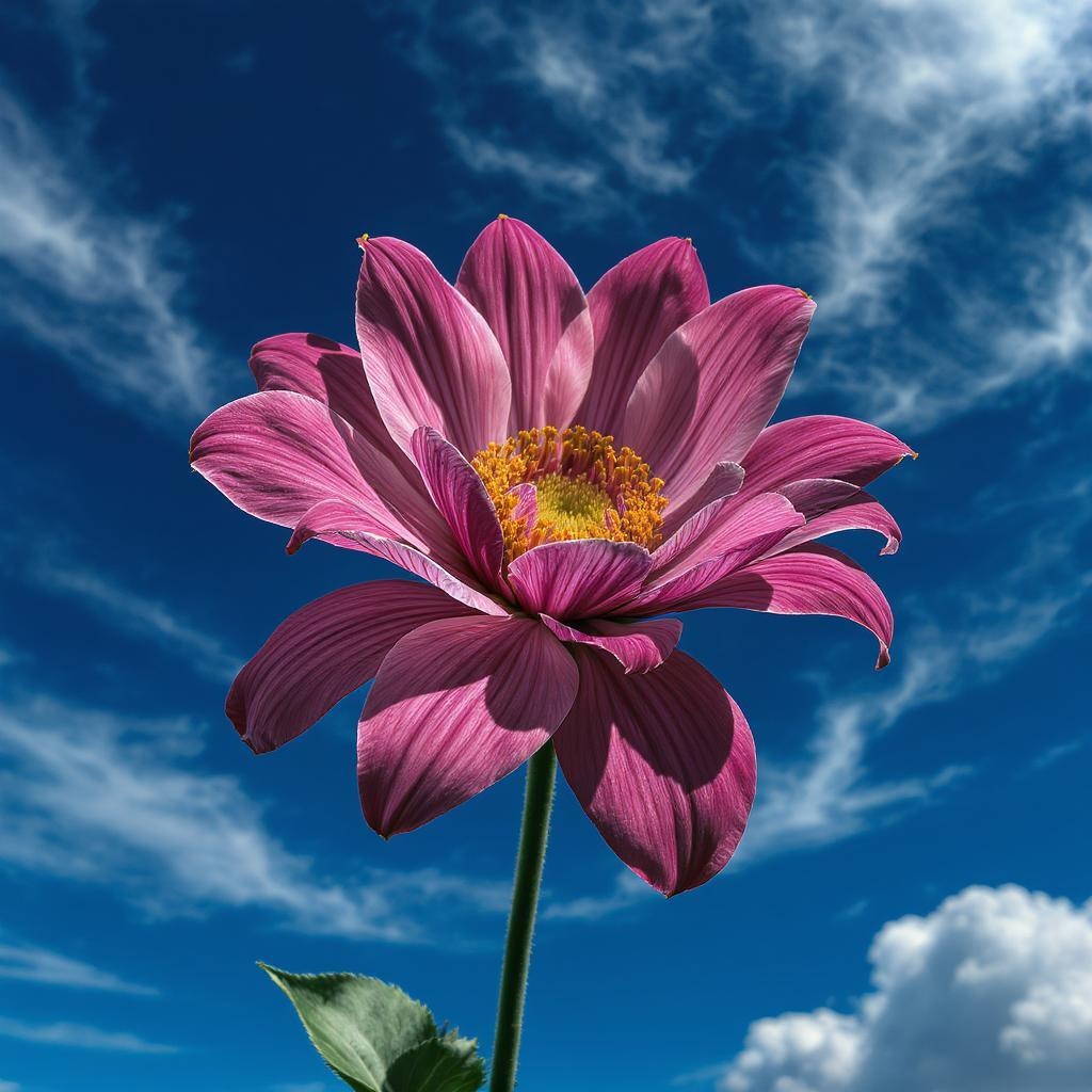 A single, vibrant flower against a vast expanse of blue sky adorned with delicate wisps of clouds, captured with the intricate precision of Miki Asai's macro photography. The image is hyper-detailed, trending on artstation for its stunning clarity and sharp focus. Studio lighting enhances the flower's intricate textures and vivid colors, evoking the meticulous artistry of Greg Rutkowski. Each petal and cloud filament is rendered with exceptional detail, creating a harmonious blend of nature's beauty and artistic mastery.