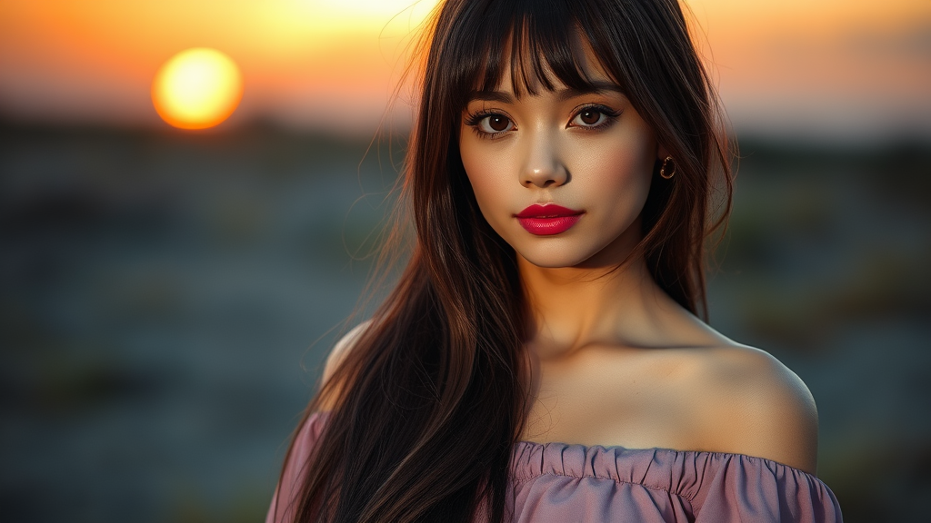 A single woman with a realistic face is captured in a photo during sunset. She wears a beautiful off-shoulder dress, with long, straight hair cascading down, featuring bangs. Her expression is shy, looking away with a slight blush on her cheeks, and her head is tilted gently to one side. The image is characterized by high contrast and sharp details, with excellent shadowing. The masterpiece is rendered in ultra-high resolution, emphasizing rich and vibrant colors. Photographed as if with a Kodak Portra 400 camera and f1.6 lens, the scene is illuminated with dramatic lighting, enhancing every intricate detail.