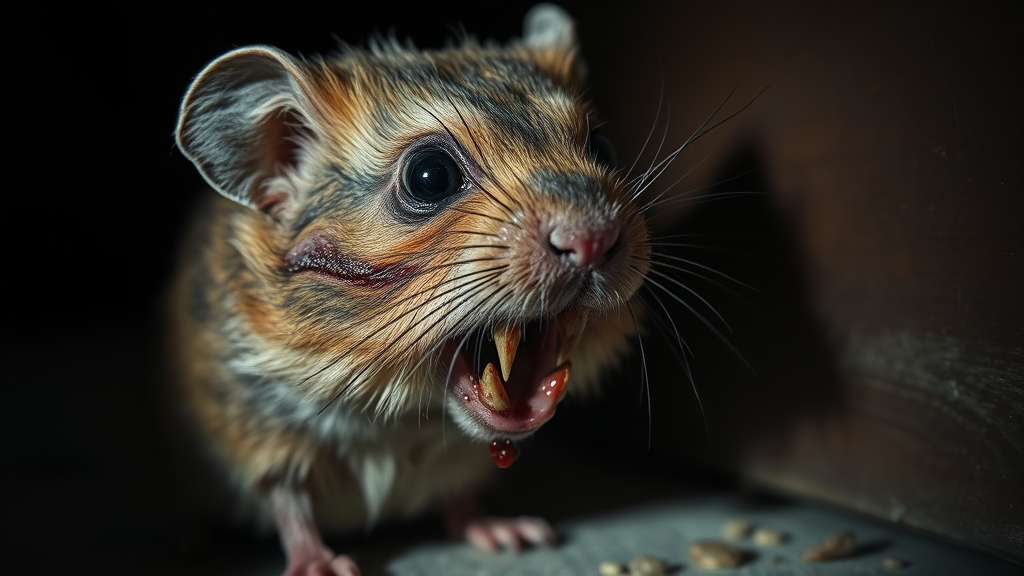 A sinister, aged hamster emerges from the shadows of a dimly lit room, its fur matted and disheveled, casting an unsettling presence against the dark background. The natural light catches the intricate details of its rough, leathery skin, emphasizing the haunting features. Its black, soulless eyes stare blankly, holding secrets of untold horrors. A long scar runs across its right cheek, a testament to past terrors. The creature's mouth gapes open, revealing unnaturally large, jagged teeth glistening with fresh blood, a chilling contrast to its small, decrepit frame. The air around it feels heavy, filled with an inexplicable dread, as the horrifying visage of this once-innocuous pet takes on an ominous life of its own, leaving an indelible mark of fear.