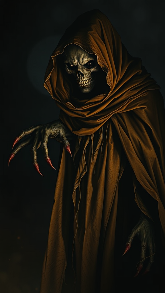 A sinister and haunting figure known as the LIFESTEALER lurks in the shadows, draped in a tattered cloak that seems to absorb the very light around it. Its hollow, glimmering eyes peer out from beneath a hood, seeking the vitality of unsuspecting victims. With gnarled, elongated fingers that reach out like the tendrils of a dark abyss, it silently prowls the night, feeding off the energy of the living. Each step it takes leaves a withering trail, its presence a chilling reminder of an insatiable hunger for life-force. Amidst whispering winds and rustling leaves, it moves with an eerie grace, a phantom of creeping dread, perpetually chasing the essence of life to sustain its own cursed existence.