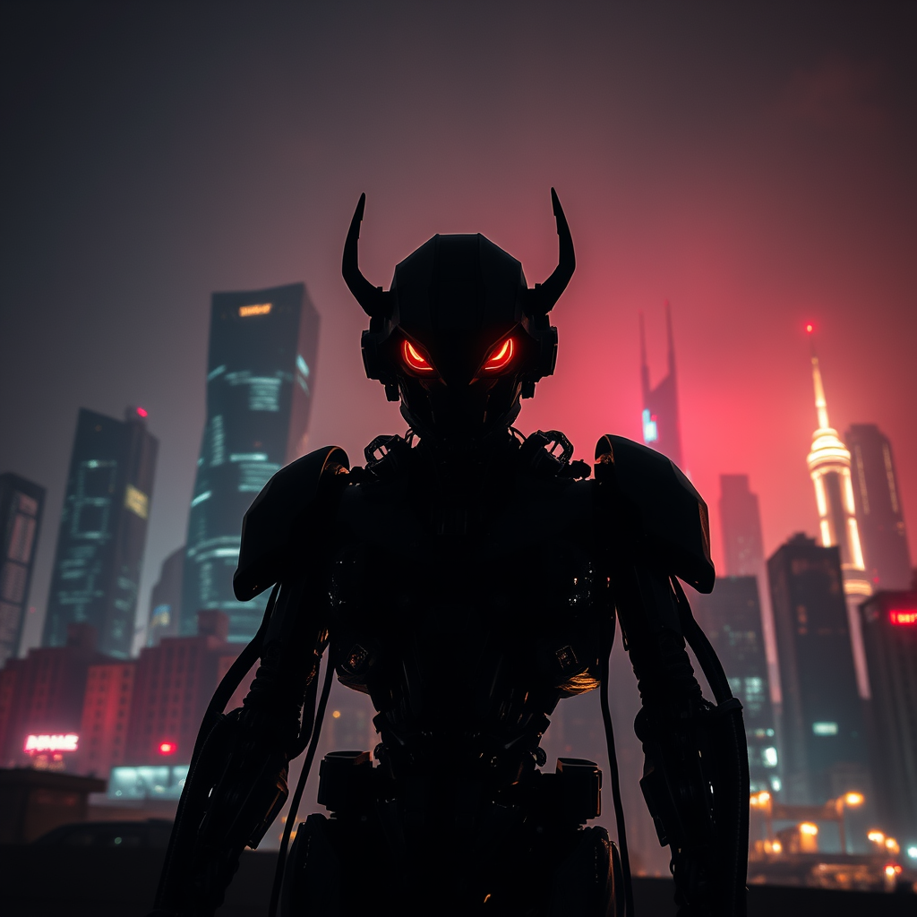 A sinister and menacing Cyberpunk robot looms against a futuristic city skyline, its presence casting an evil aura across the surroundings. The dark and gritty atmosphere is enhanced by the nighttime setting, captured with a mirrorless camera and ultra-wide lens. The scene is bathed in neon glows and shadows, accentuating the robot's intimidating silhouette. Shot in manual mode at a shutter speed of 1/60, aperture f/2.8, and ISO 3200, the digital image embraces a low realism level, amplified by post-processing techniques such as color grading, vignette, and subtle light leaks. The aspect ratio of 2.35:1 frames the futuristic cityscape and the foreboding figure, creating a captivating and immersive cyberpunk vision.