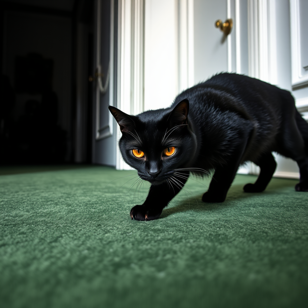 A sinister cat with blazing red eyes and an ominous glare, its fur a deep, jet black with subtle streaks of gray, prowls across the shimmering surface of a luxurious apartment's green carpet, which eerily mirrors scenes from Dante's Inferno. The stark black of the cat's coat stands out dramatically against the pristine white walls as it emerges from a shadowy hallway. The focus is from a low angle, enhancing the cat's realistic and menacing features against the backdrop of its elegant surroundings.