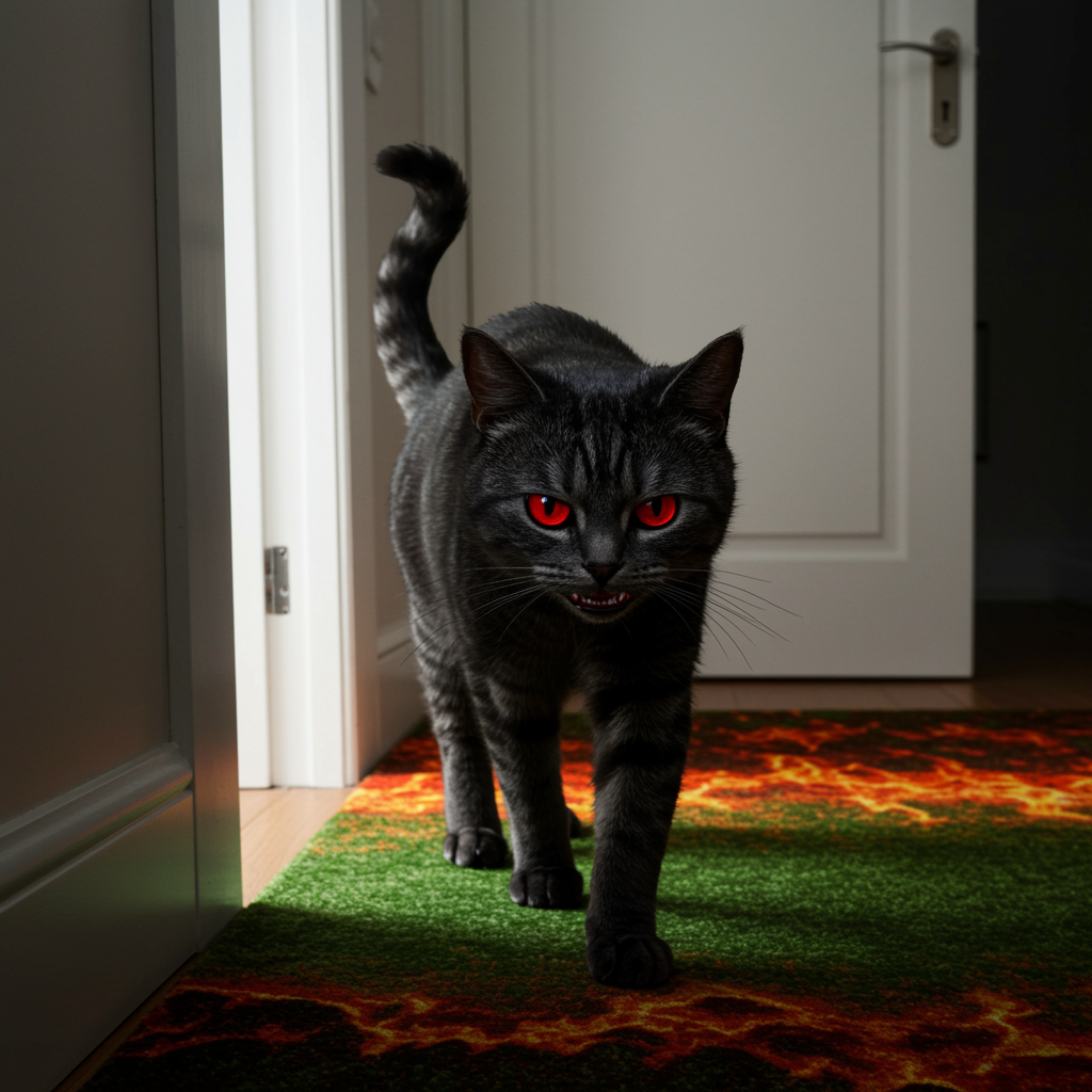 A sinister cat with burning red eyes and an ominous gaze, its fur as black as midnight with subtle streaks of silver, prowls across the polished floor of a sophisticated apartment. It steps onto a lush green carpet that eerily mirrors the fiery depths of Dante's Inferno. The cat's dark silhouette is starkly contrasted against the pristine white walls as it emerges from a shadowy corridor. The perspective is angled slightly from above, capturing the cat's features with striking realism.
