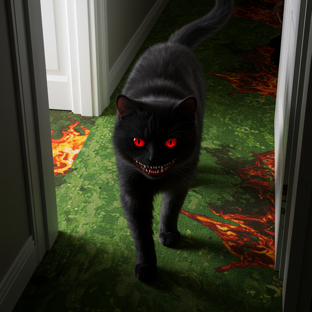 A sinister cat with glowing red eyes and a malevolent expression, its fur a deep obsidian with subtle streaks of ash gray, prowls across the floor of an opulent apartment. Its paws silently tread a vibrant green carpet that eerily mirrors scenes reminiscent of Dante’s Inferno. The cat’s jet-black silhouette starkly contrasts with the pristine white walls, emerging from a shadowy hallway that conceals its approach. Viewed from an elevated perspective, the cat's features are strikingly lifelike, its presence both mesmerizing and unnerving.