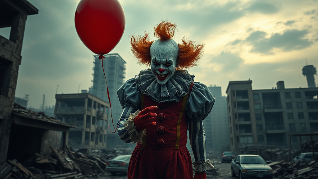 A sinister clown with a menacing grin holds a red balloon amidst a dystopian post-apocalyptic landscape, surrounded by crumbling buildings. The scene evokes a chilling still from a horror film, rendered in photorealistic detail, capturing the eerie atmosphere and unsettling presence of the character in a devastated world.