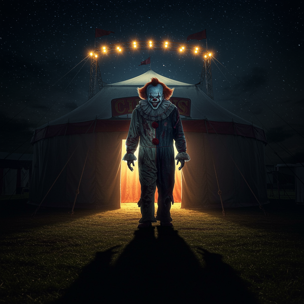 A sinister clown with a menacing grin stands ominously before the brightly lit entrance of a vintage circus tent under a starry night sky, captured in high resolution with a professional lens; the clown's shadow stretches dramatically across the ground, illuminated by an eerie dynamic light from behind, casting an unsettling glow that enhances the vivid colors of the clown's tattered costume and smeared face paint, framed at a cinematic angle to highlight the tension in the scene.
