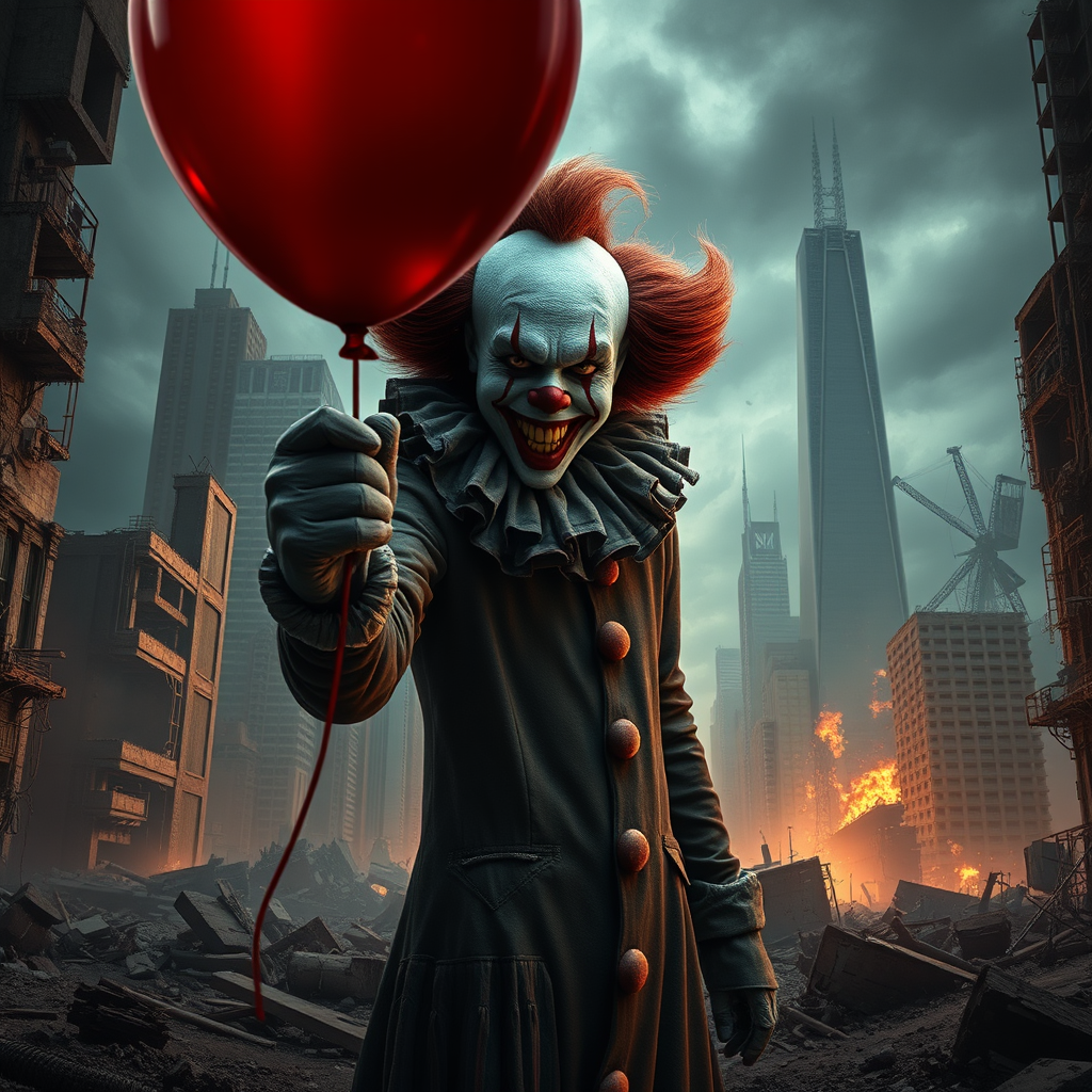 A sinister clown with a mischievous grin holds a crimson balloon amidst a dystopian, post-apocalyptic landscape filled with crumbling skyscrapers and ruins, reminiscent of a scene from a tense and atmospheric thriller, captured with photorealistic detail and dramatic lighting.