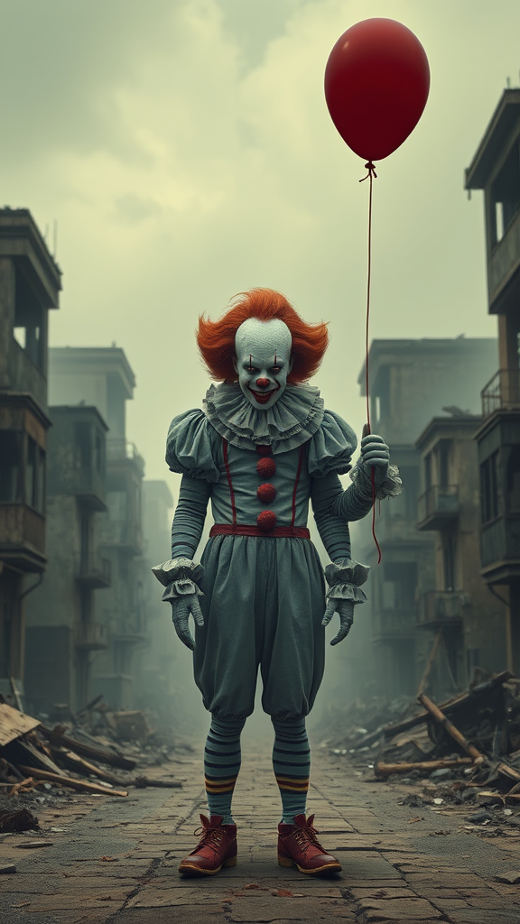 A sinister clown with a red balloon, reminiscent of Pennywise, stands amidst a dystopian post-apocalyptic landscape filled with crumbling buildings. The scene captures a photorealistic horror essence, as if pulled from a chilling movie still.
