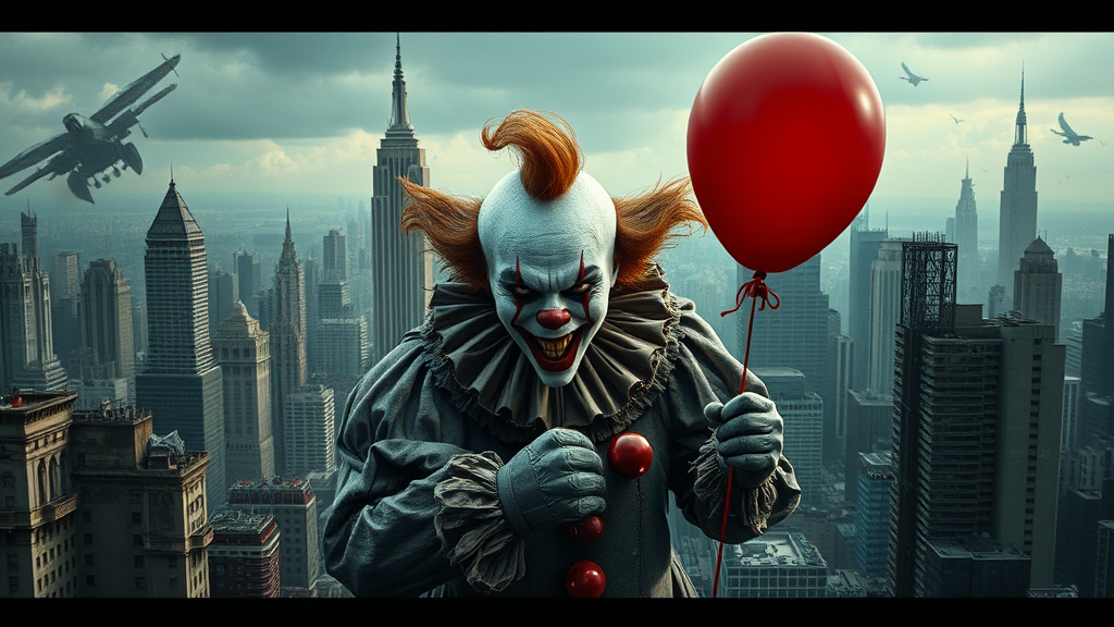A sinister clown with exaggerated features and a menacing smile holds a red balloon amidst a dystopian, post-apocalyptic landscape of crumbling skyscrapers and ruined cityscapes, inspired by haunting horror film imagery, captured in realistic detail with dramatic lighting and shadowing.