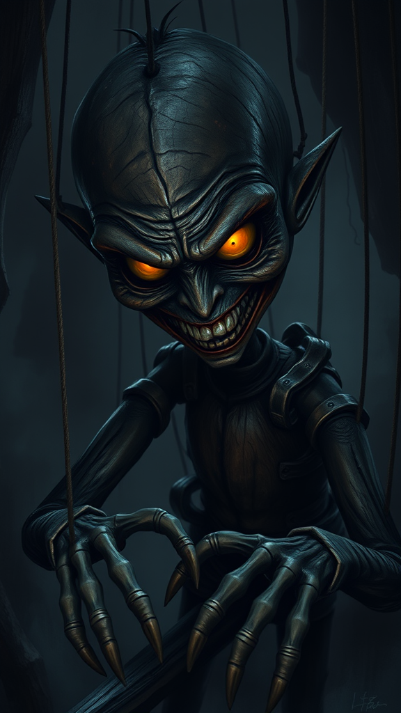 A sinister, contorted marionette resembling an ominous version of Pinocchio, with dark wood grain skin and shadowy, glowing eyes, depicted in a Dungeons & Dragons fantasy art style. The detailed portrait showcases intricate joints and exaggerated features, with a malevolent grin etched into its face, nestled within a dark, eerie setting.