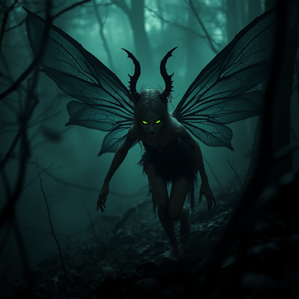A sinister fairy with wings lurks in the shadowy woods, her eyes glowing a malevolent green. The air is thick with an eerie mist, enhancing her demonic, unholy presence. Creeping through the horror-filled darkness, she embodies a chilling, sinister allure with her intricate design and menacing details. The atmosphere is steeped in dramatic lighting that casts sharp contrasts, highlighting her wicked features. The scene is photorealistic and cinematic, with a haunting 8k clarity that captures every unsettling nuance.