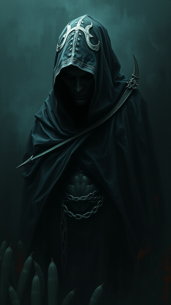 A sinister figure shrouded in darkness, an epic composition that exudes elegance and brutality, digitally painted with intense and brooding dark tones. The piece is an exceptionally high-resolution masterpiece, leaving an indelible and haunting impression on the psyche. Despite its high quality, it possesses a curious mix of blurred and grainy textures, with hints of plastic-like sheen and duplicate imagery. The anatomy is stylized with peculiar distortions, and subtle text, signatures, and watermarks are hidden within the artwork. A striking juxtaposition of excellence and imperfection, marred by JPEG artifacts that amplify its haunting nature.