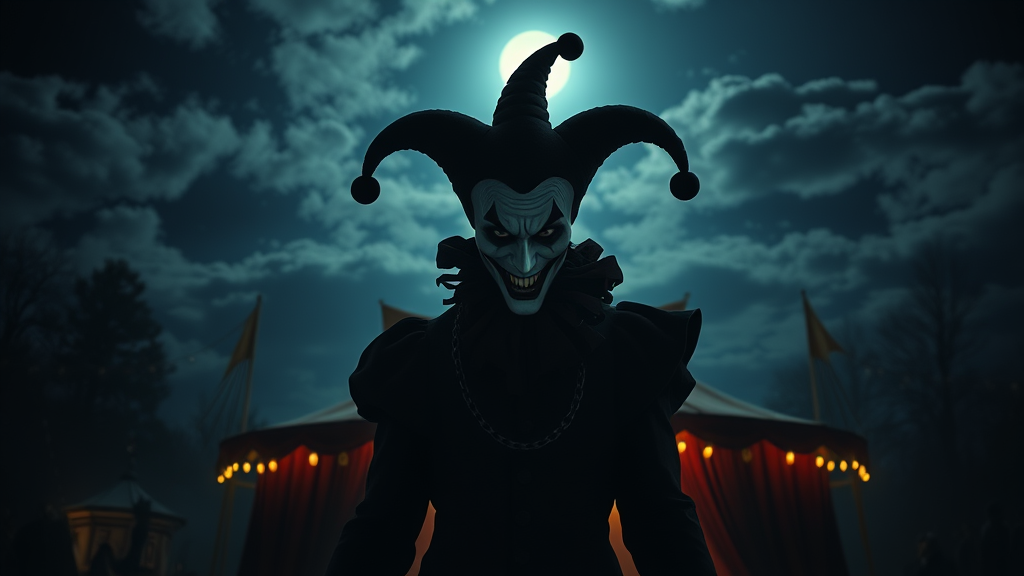 A sinister jester looming before the dimly lit carnival tent under the moonlit sky, high-resolution, lifelike image, expert photography, dramatic viewpoint, illumination casting eerie shadows from behind.