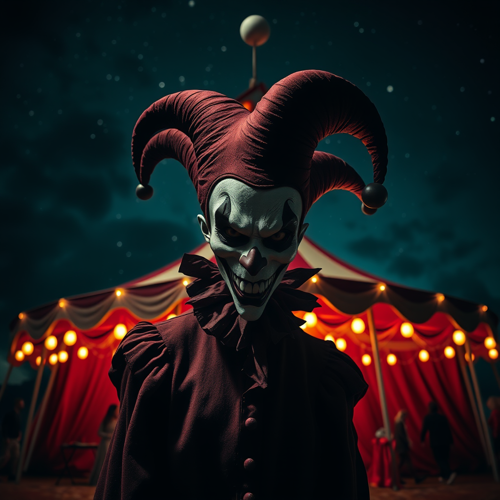 A sinister jester looming in front of a dimly lit carnival tent under the stars, high-resolution and hyper-realistic imagery, captured with expert photography skills, showcasing a dramatic angle with dynamic backlighting casting eerie shadows.