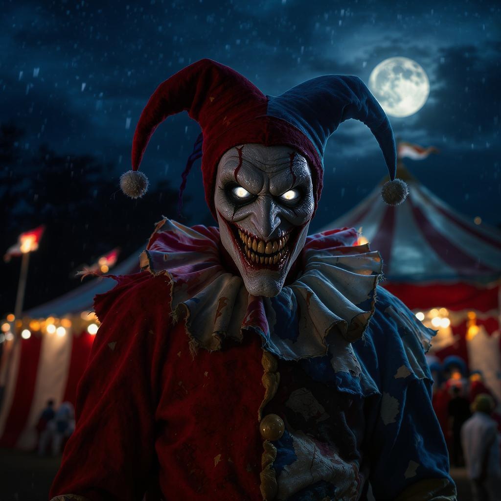 A sinister jester looms ominously before the moonlit circus tent, his menacing grin illuminated by the eerie glow of carnival lights, captured in a high-resolution, lifelike photograph with a dramatic cinematic angle that emphasizes the contrasting shadows and vibrant colors.