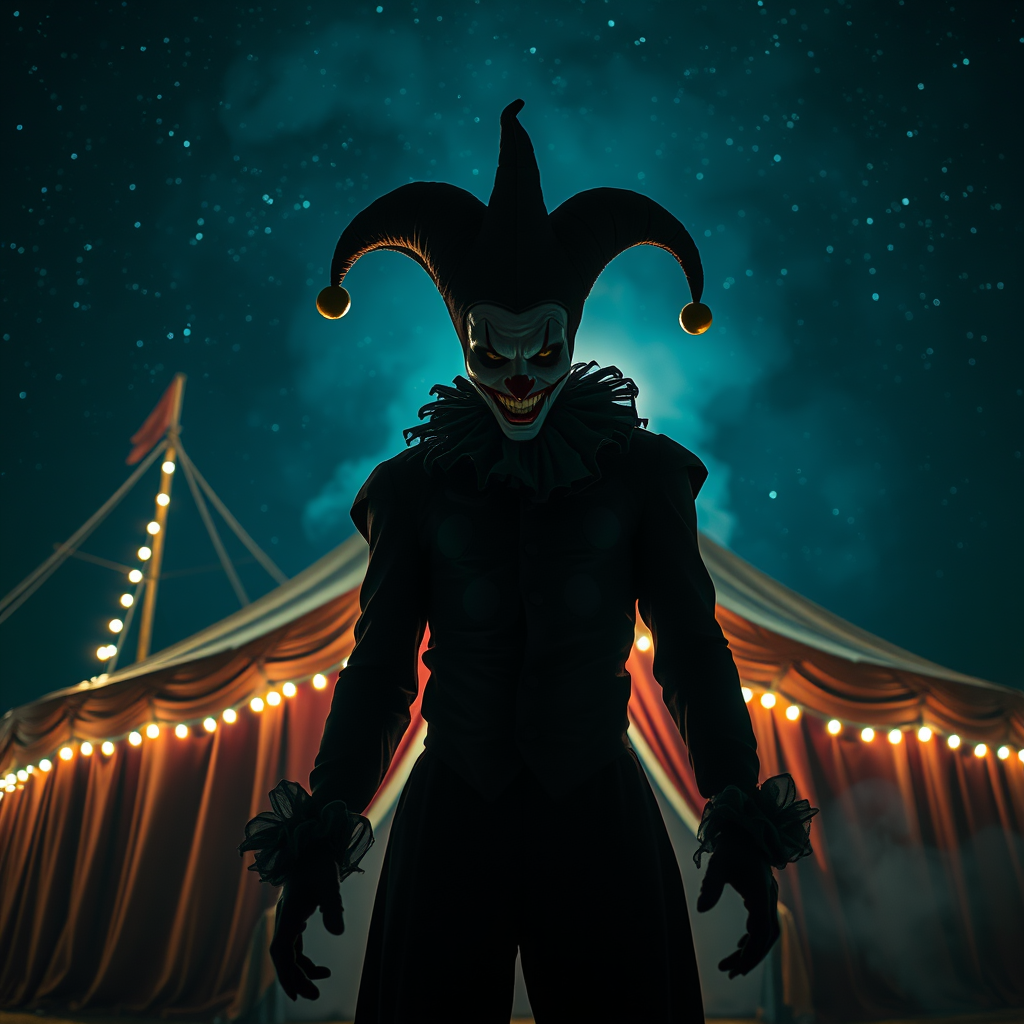 A sinister jester poised ominously in front of a dimly lit circus tent under the starry night sky, captured in high resolution with a keen eye for professional photography, the composition showcasing a cinematic angle as an ethereal glow from behind casts haunting shadows, adding a touch of drama and mystery to the scene.