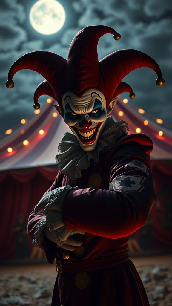 A sinister jester with a wicked grin poses ominously before the circus tent under the moonlit sky, captured in high-resolution, with a professional cinematic angle emphasizing his menacing stance; dynamic backlighting casts eerie shadows, highlighting his vivid costume and malevolent eyes.