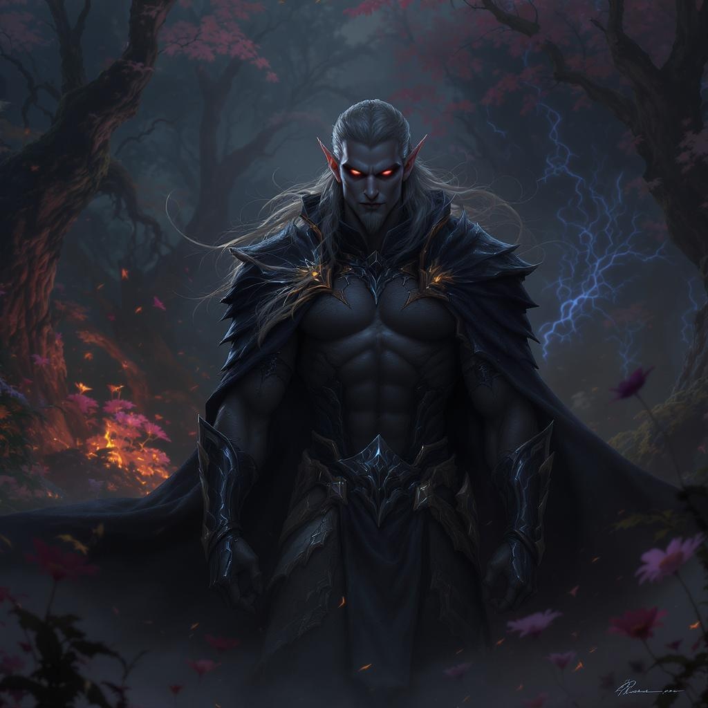 A sinister male elf antagonist with piercing eyes and an air of dark charisma, surrounded by a mystical forest bathed in enchanting twilight. His perfectly sculpted features and lithe, agile physique exude an aura of dangerous beauty. The scene is alive with vibrant colors and ethereal details, casting dramatic shadows across his form, epitomizing a cinematic masterpiece of fantasy ambiance and stunning visuals.