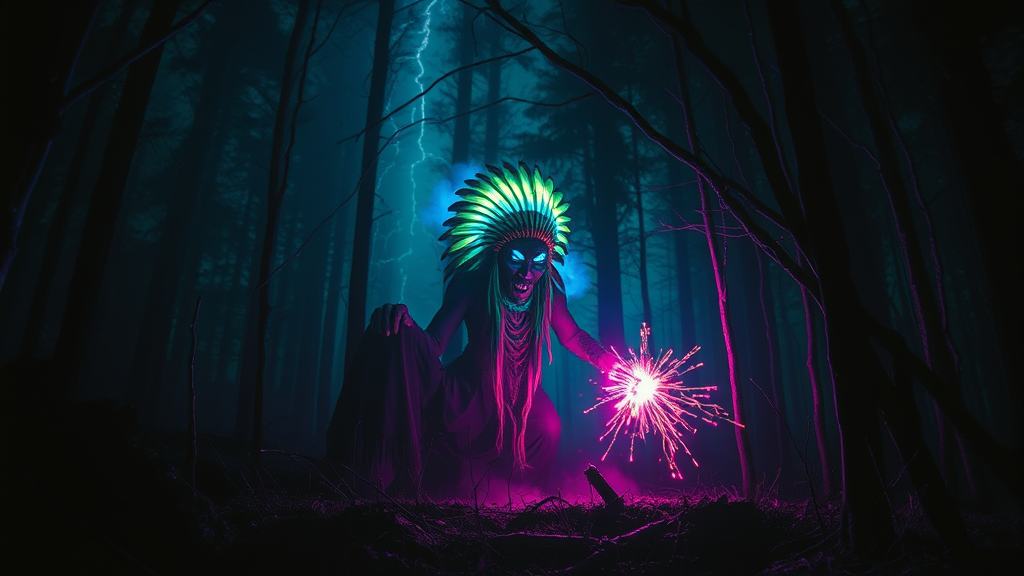 A sinister Native American evil spirit lurks in the shadowy depths of the woods, captured in the style of night photography with intense color saturation. Vivid energy explosions illuminate the scene, casting eerie, otherworldly hues across the landscape. The spirit is a menacing figure, its form a surreal fusion of spectral darkness and vibrant, pulsating colors. The air crackles with electric tension, capturing the vivid dynamism of an EC Comics horror tale brought to life.