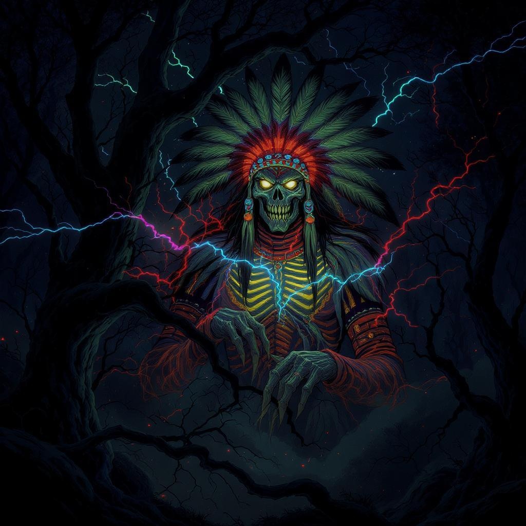 A sinister Native American spirit lurks within the shadowy depths of the woods, captured in the haunting style of night photography. Intense bursts of vivid color illuminate the scene, with vibrant energy explosions piercing the darkness. The spectral figure, reminiscent of EC Comics' eerie illustrations, exudes an ominous presence that blends traditional lore with otherworldly dimensions, casting an unsettling glow through the twisted branches and eerie landscapes.