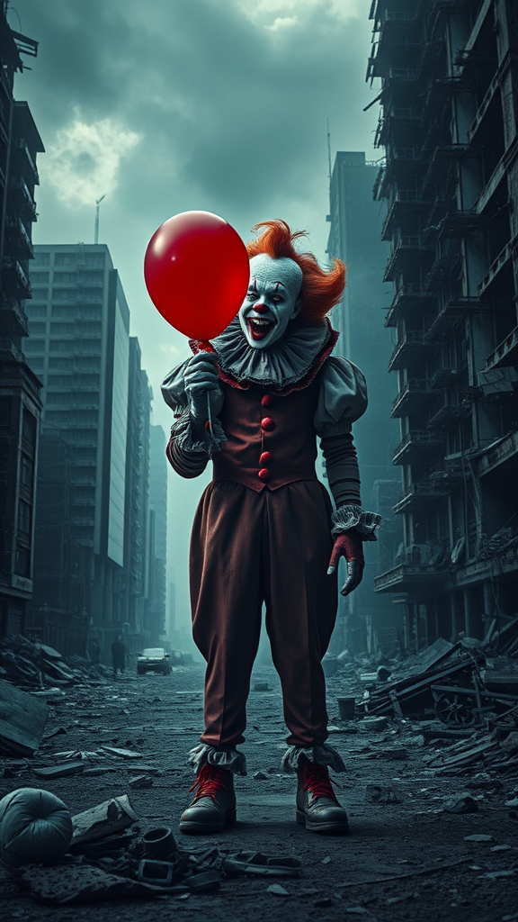 A sinister Pennywise-like clown stands menacingly in a dystopian, post-apocalyptic landscape, gripping a vibrant red balloon amidst the ruins of collapsed skyscrapers and debris-filled streets. Its eerie laughter echoes through the shadows of the destruction, creating an unsettling juxtaposition. The scene captures a photorealistic, cinematic essence reminiscent of a still from a haunting thriller, with a dark, moody atmosphere that underscores the terror lurking within this ravaged world.