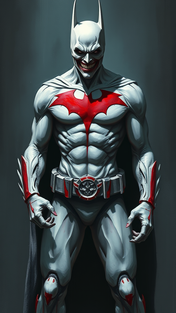 A sinister, warped figure resembling Batman stands against a shadowy backdrop. The figure's suit is predominantly white with hints of light gray, giving it an eerie, spectral appearance. A jagged, blood-red bat symbol slashes across its chest, with red streaks accentuating the gauntlets, belt, and cape edges. The most chilling aspect is the face – a pallid, skeletal visage twisted into a maniacal, Joker-like grin. This image conveys a distorted, malevolent version of the iconic hero. The digital painting embraces a loose, expressive style, with rough brushstrokes and intricate textures. The color palette is stark and dramatic, highlighting the sharp contrast between white and red against the dark background. Dim, moody lighting enhances the atmosphere of dread. The pose and expression suggest a sense of threat and instability, staying true to the core concept while integrating subtle creative changes.