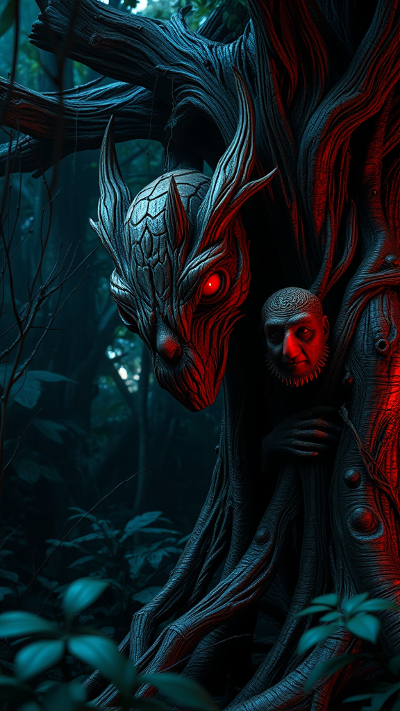 a sinister wood creature with glowing red eyes emerges from the shadows, its form a blend of filip hodas’s surreal textures and daz3d realism, nestled within a mysterious jungle setting reminiscent of natalia rak’s vibrant imaginings. this being, with its anthropologically inspired design, showcases hyper-realistic details that captivate and unsettle, rendered in ultra-detailed 32k uhd, creating a true masterpiece. nearby, a peculiar man with a vivid red nose camouflages himself within the gnarled branches of an ancient tree, their presence imbued with the colorful charm of sandy skoglund’s woodcarvings. with hints of frogcore aesthetics intertwined with lovecraftian intrigue, the scene reveals characterful animal portraits that bring this eerie tableau to life, capturing the surreal quintessence of a daz3d hyper-detailed rendering.