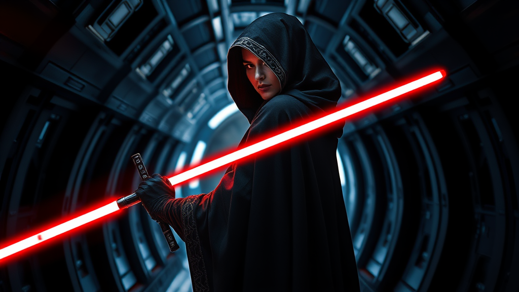 A Sith woman with glowing red eyes, brandishing a menacing red lightsaber in her right hand, poised at a 45-degree angle. Enveloped in a flowing black cloak, she stands with an air of fury and defiance, her back to the viewer, revealing the intricately designed hood. The dimly lit corridor of a dark spaceship creates an ominous backdrop, its metallic walls reflecting the crimson glow of her saber, casting sharp shadows that dance around her figure.