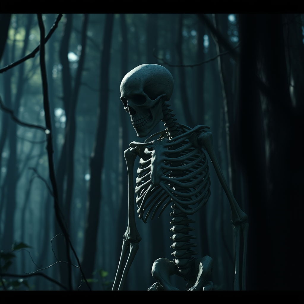 A skeletal figure lurking in the forest, resembling a ghoul, exuding an unsettling and unholy presence; its gaunt form accentuated by eerie shadows. Disturbingly intricate features with a hauntingly elaborate detail. The atmosphere is drenched in a dramatic interplay of light and shadow, creating a chilling, photorealistic scene. Cinematic in scope, capturing every nuance of this dark spectacle, rendered in stunning 8k resolution -- aspect ratio 9:16 -- version 5.