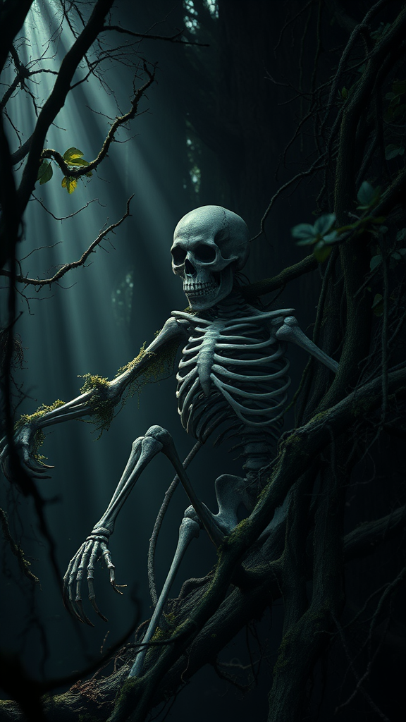 A skeletal figure lurks among the forest shadows, its ghastly form exuding an aura of dread, terrifying yet captivating in its grotesque elegance, with eyes that seem to pierce through the darkness, unholy and sinister, crawling with creeping vines and moss that whisper of ancient curses, shrouded in an intricate weave of gnarled branches and decaying foliage, illuminated by dramatic shafts of ghostly light piercing through the canopy, photorealistic and cinematic quality, capturing every nightmarish detail in ultra-high definition, an eerie tableau that feels both timeless and otherworldly.